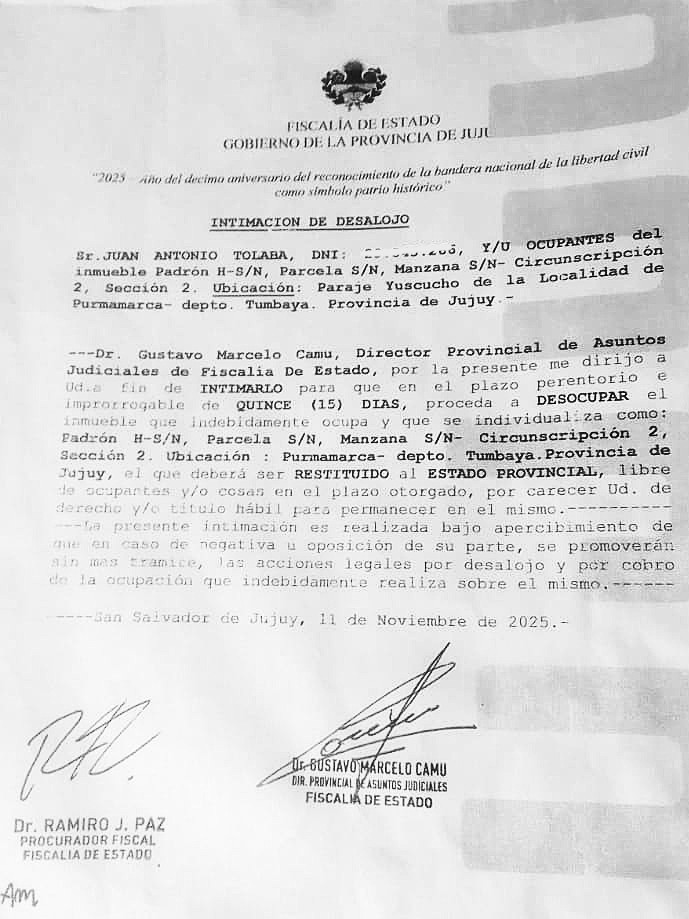 La comunidad indígena de Ci.Pa.Qui (Ciénaga, Petacalco y Quisquiri), en Purmamarca, Jujuy, denunció la intimación de desalojo contra una familia integrante del territorio comunitario. La notificación, fechada el 11 de noviembre y firmada por el director provincial de Asuntos Judiciales, Gustavo Marcelo Camu, y el Procurador Fiscal Ramiro J. Paz, establece un plazo de quince días para abandonar la vivienda.