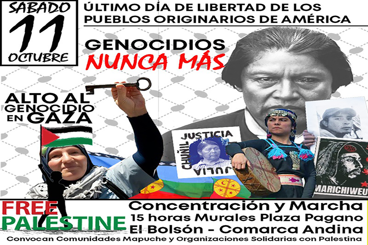 Comunidades Mapuche-Tehuelche y organizaciones sociales movilizadas ante el genocidio en Palestina y el avasallamiento hacia las Comunidades Originarias convocan a una jornada de movilización y micrófono abierto en la Plaza Pagano de El Bolsón (Río Negro) el sábado 11 de octubre a las 15 horas. La iniciativa surge como respuesta al genocidio en Palestina y al avance sistemático sobre los derechos de las comunidades originarias en distintos territorios. La actividad se enmarca en la conmemoración del “Último día de Libertad de los Pueblos Originarios de América” y busca articular reflexiones sobre la situación en Medio Oriente y las luchas indígenas en el continente.