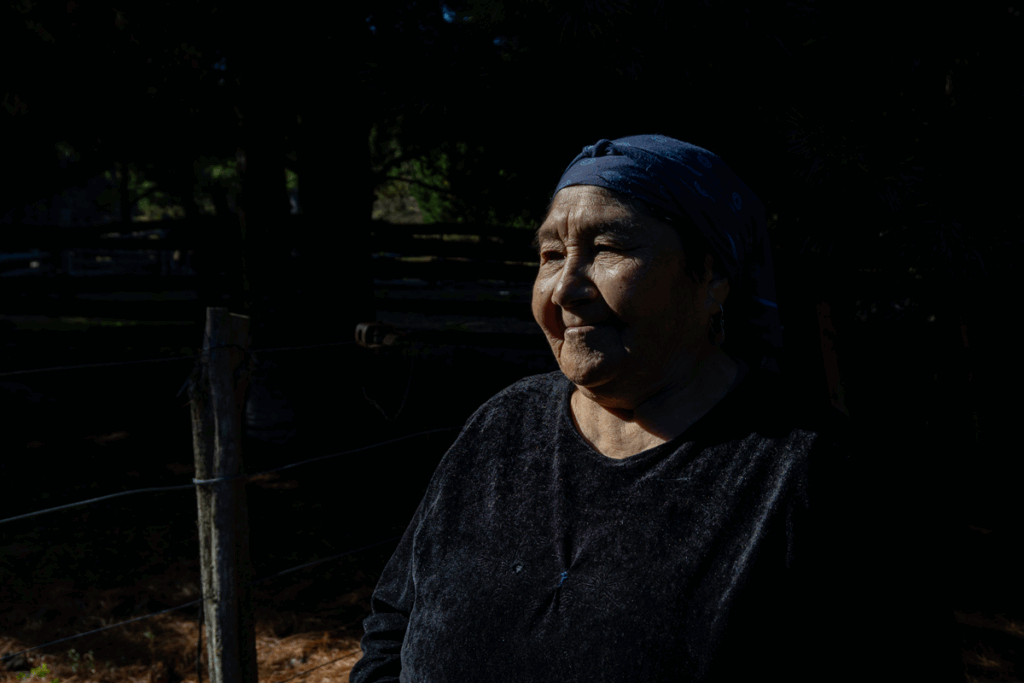 La anciana apenas puede caminar y tiene problemas de visión. Sobrevivió a incendios forestales en el territorio que protege, vive de la huerta y de sus tejidos. Desde la llegada de estos empresarios, la vida de Isabel cambió. Su trabajo en la huerta, la cría de animales y su oficio de tejedora se vieron afectados y el hostigamiento es hacia toda su familia.