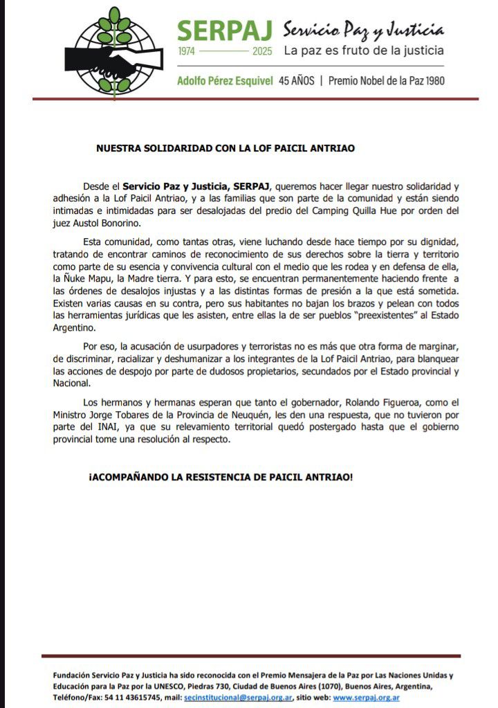 El Servicio Paz y Justicia (SERPAJ), organización fundada por el Premio Nobel de la Paz Adolfo Pérez Esquivel, expresó su apoyo a la comunidad. Bajo el título “Nuestra solidaridad con la Lof Paicil Antriao”, SERPAJ respaldó a las familias intimadas al desalojo del Camping Quilla Hue y reafirmó la preexistencia del Pueblo Mapuche al Estado argentino.