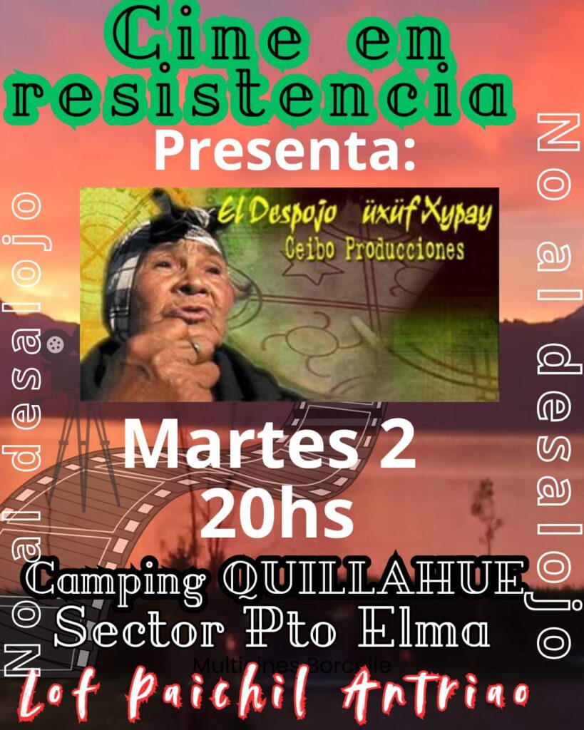 En este contexto, la comunidad convocó a una actividad cultural en el mismo espacio amenazado por el desalojo. El 2 de diciembre a las 20 horas, en el Camping Quilla Hue, realizarán la jornada “Cine mientras resistimos”, con la proyección del documental Üxüf Xipay – El Despojo (2003), dirigido por Dauno Tótoro.