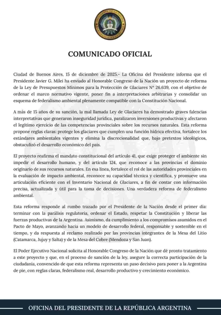 El presidente Javier Milei envió al Congreso un proyecto para reformar la Ley de Presupuestos Mínimos para la Protección de Glaciares (N° 26.639). Bajo la premisa de “ordenar el federalismo” y destrabar inversiones, el Ejecutivo busca redefinir qué áreas de hielo merecen protección estatal. Con la reforma de esta ley, se beneficiarían empresas mineras y se generaría un grave riesgo en el ecosistema periglacial, comprometiendo las reservas estratégicas de agua dulce y las cuencas que dependen del deshielo para el consumo humano y la subsistencia de comunidades locales.