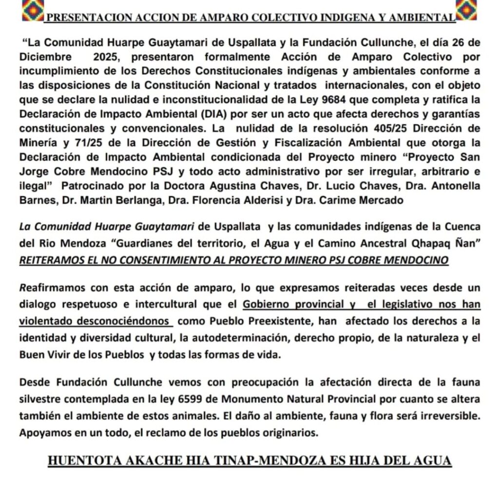 Presentado por la Comunidad Huarpe Guaytamari, de Uspallata, y la Fundación Cullunche, plantea el incumplimiento de los Derechos Constitucionales Indígenas y ambientales conforme a las disposiciones de la Constitución Nacional y Tratados Internacionales. Solicita la nulidad e inconstitucionalidad de la Ley 9684 que contempla la DIA, y la nulidad de la resoluciones 405/25 y 71/25 y todo acto administrativo “por ser irregular, arbitrario e ilegal”.